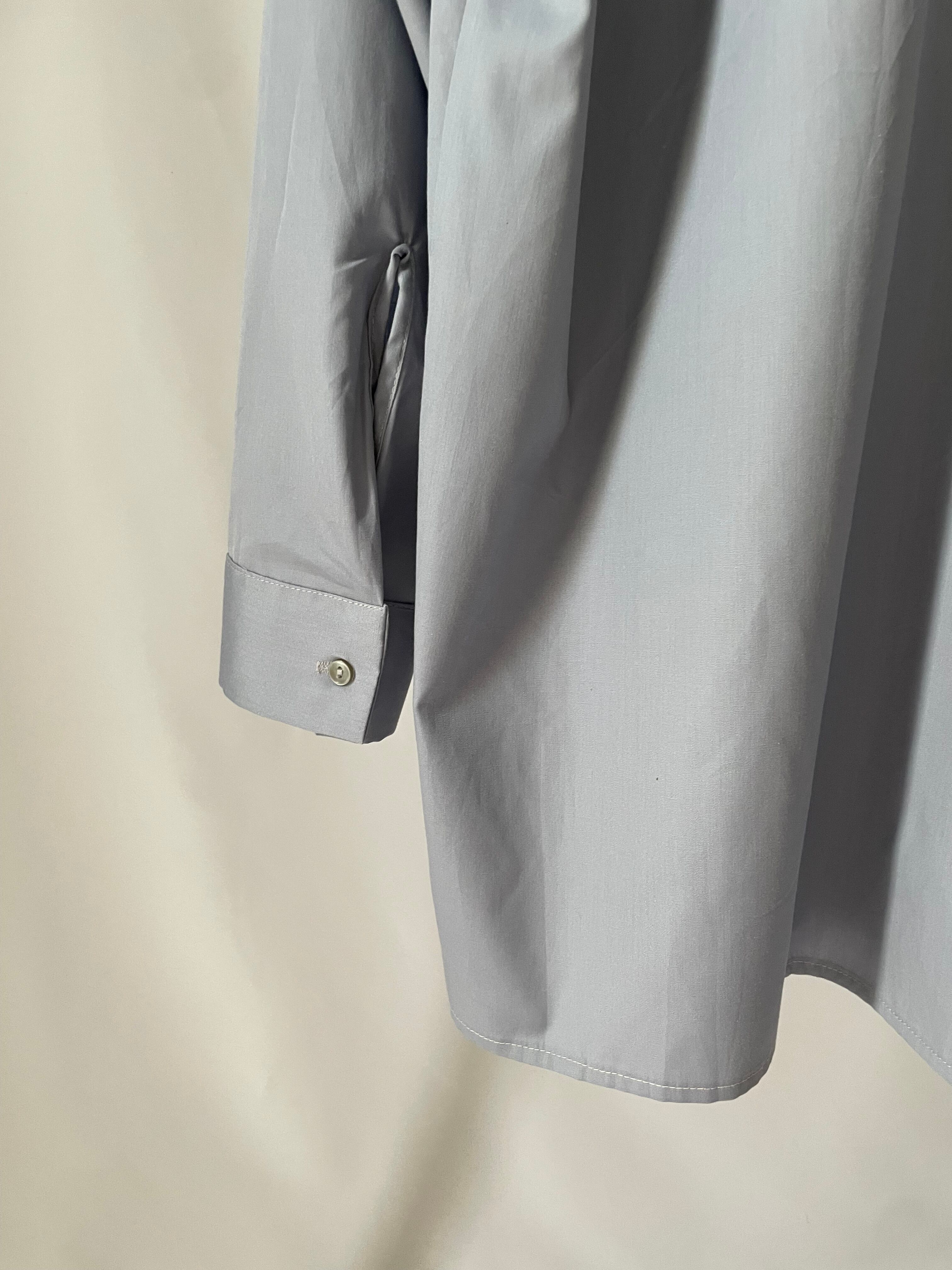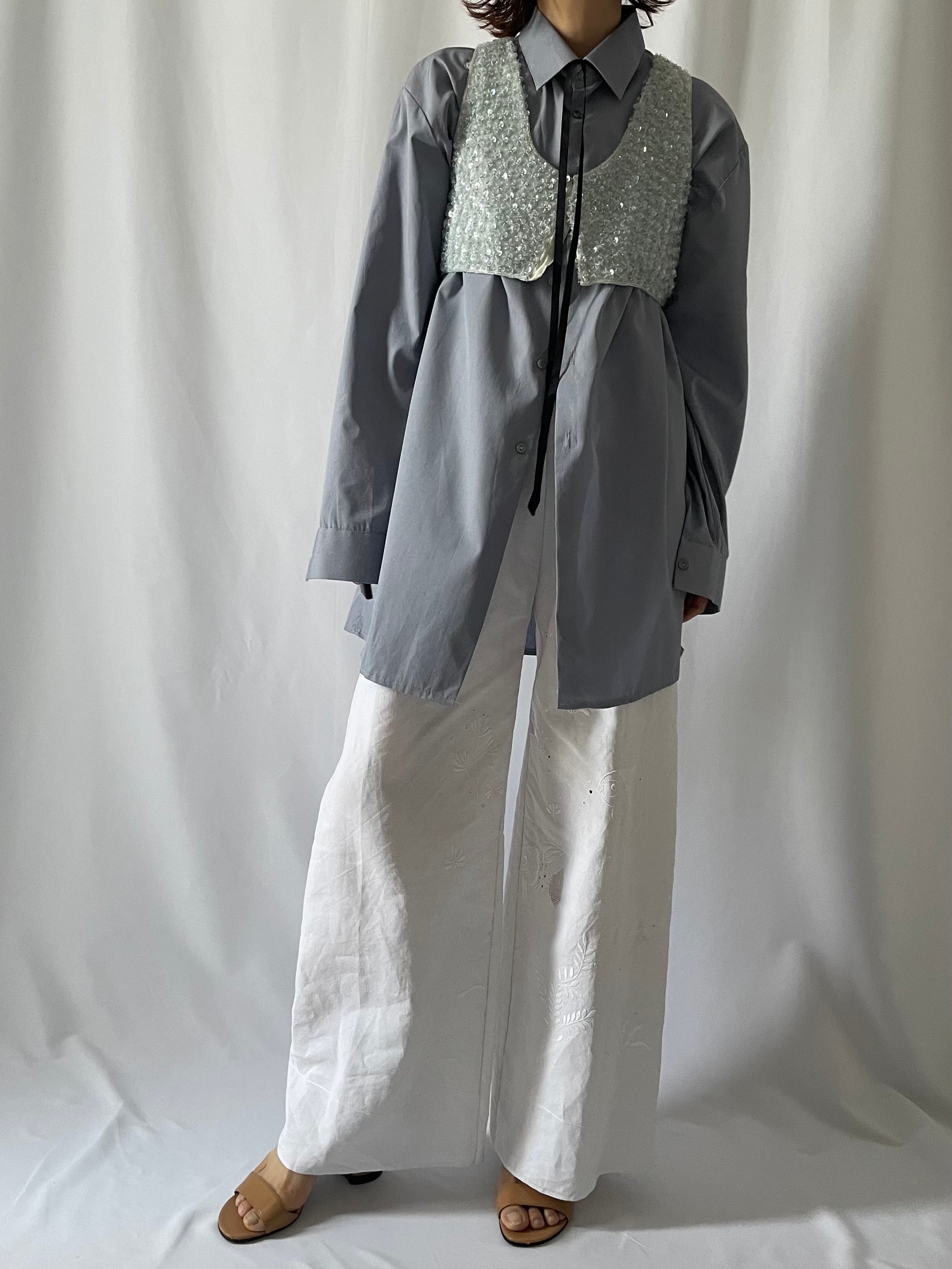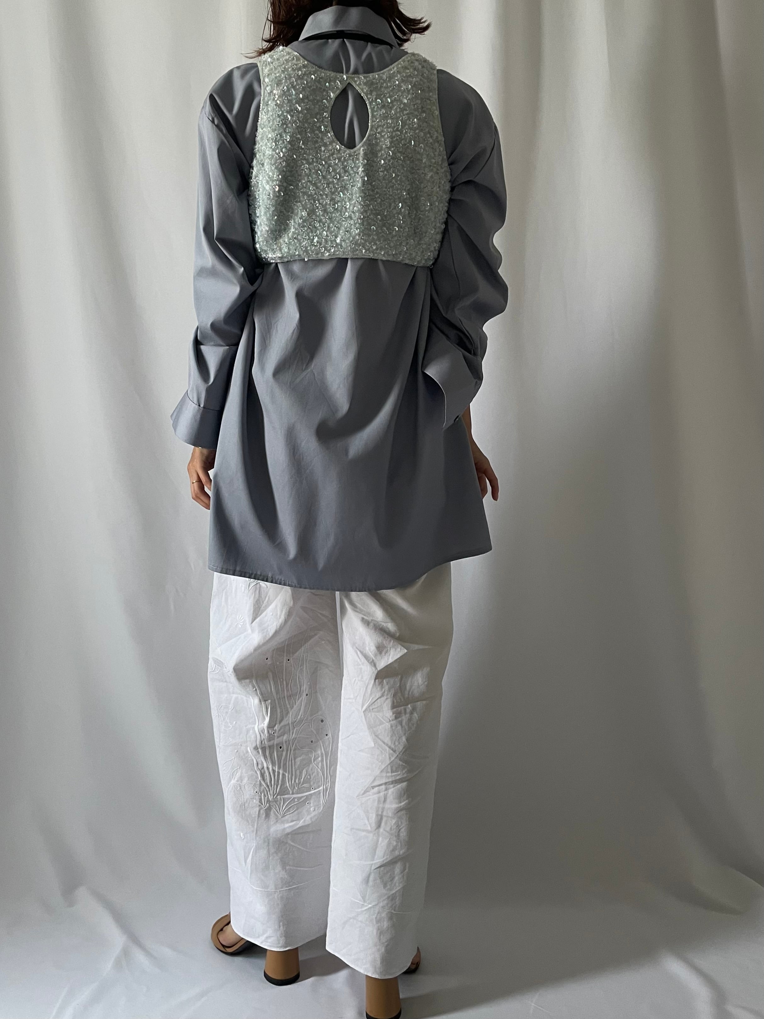 胸ポケットのないタイプで、ビスチェやベストなど重ね着しやすいかなと思いました。