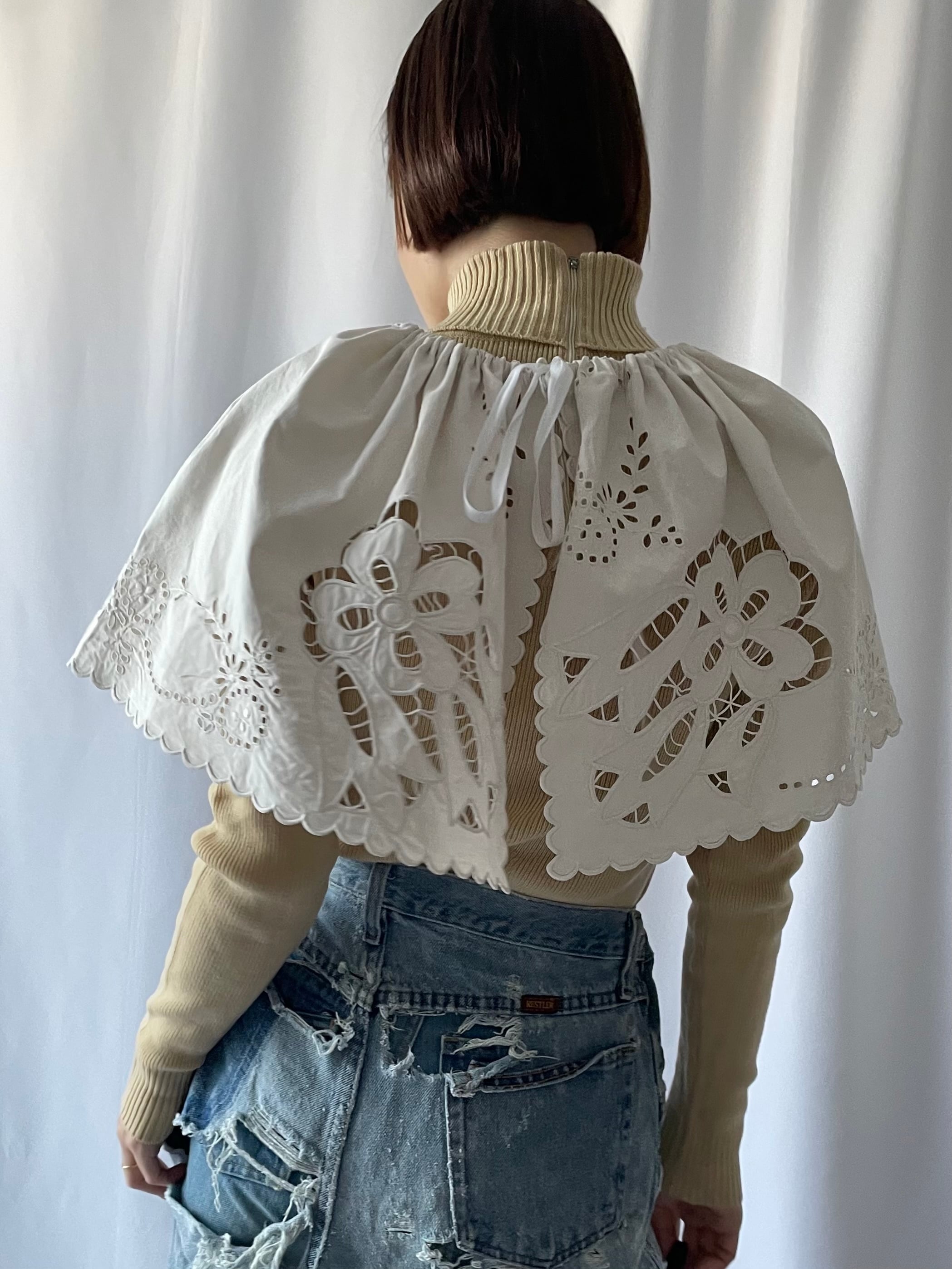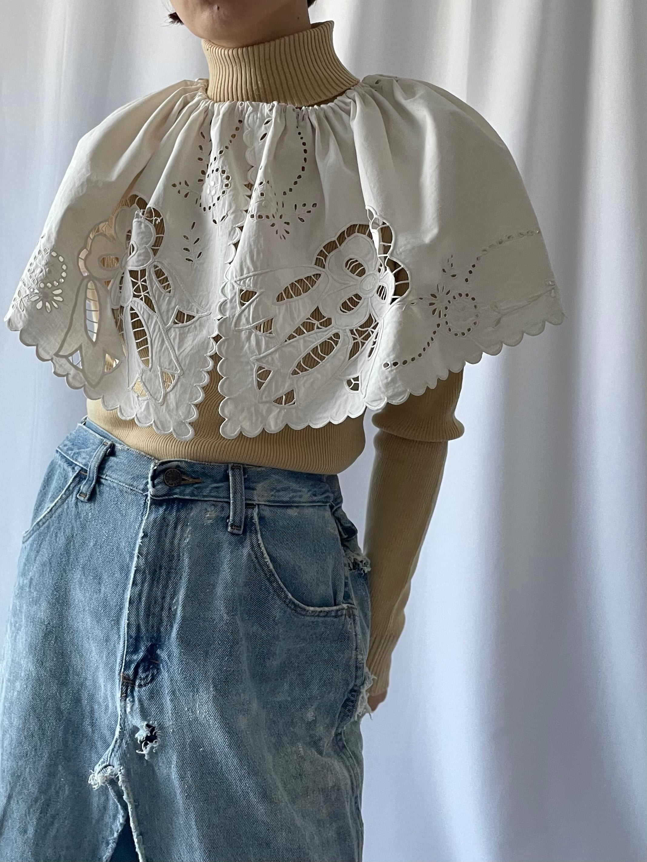 大きなつけ襟のようにも、ウエストで巻いてプラスワンスカートのようにもいろいろな合わせを楽しんでいただきたいです。