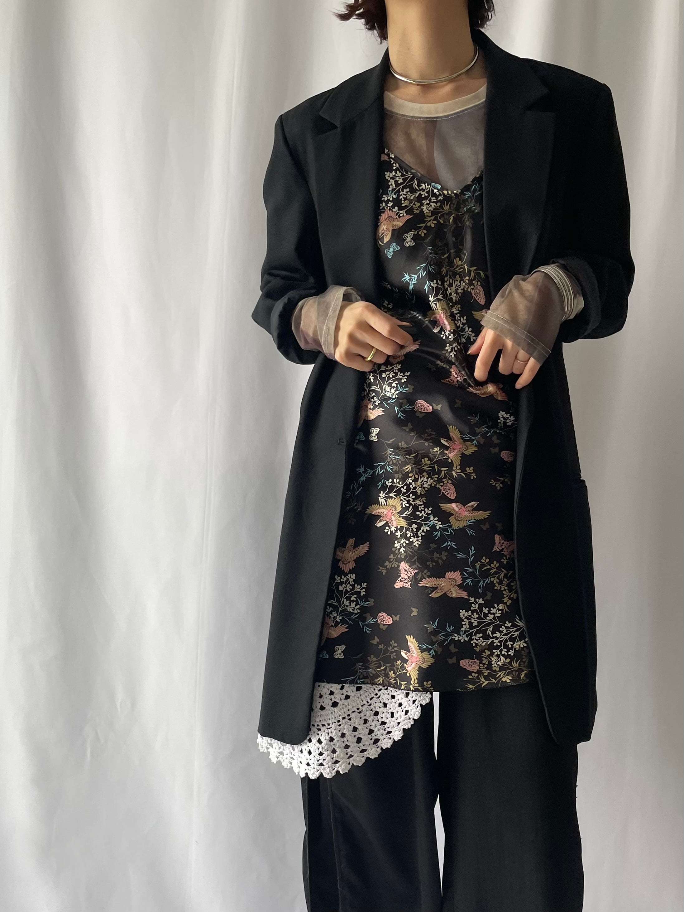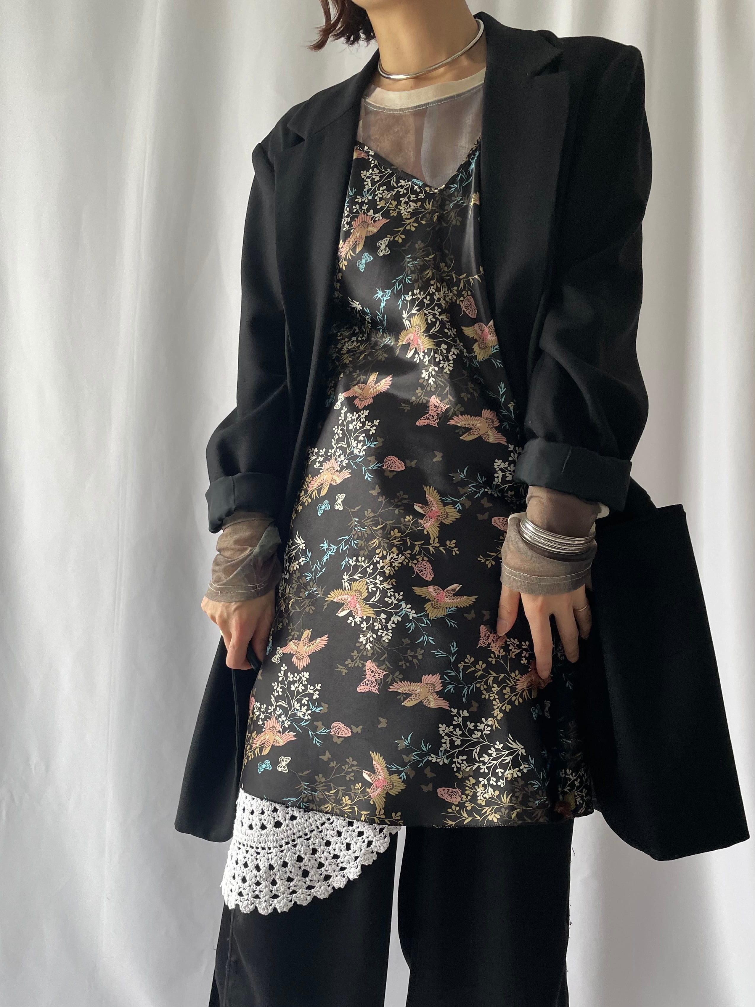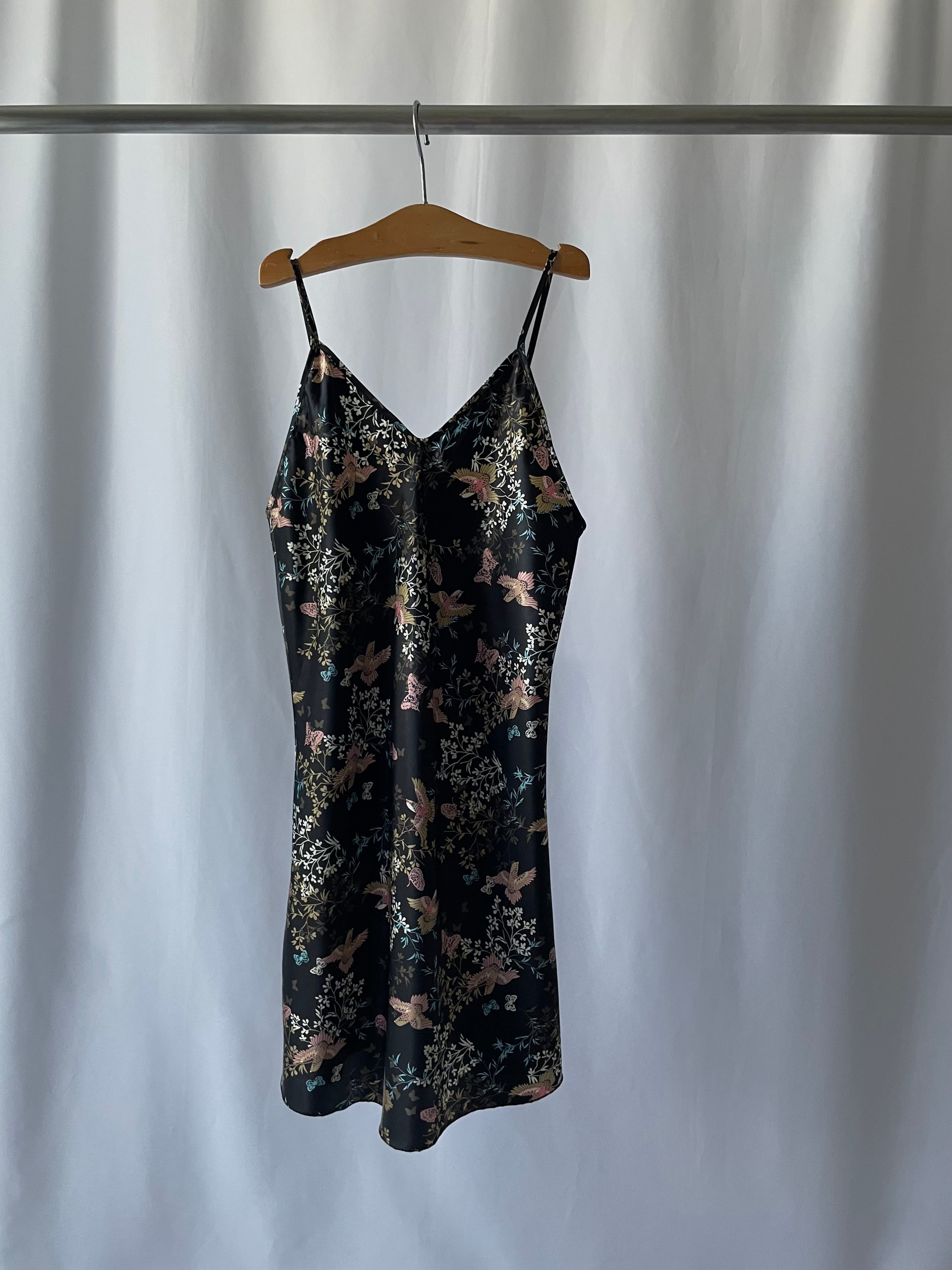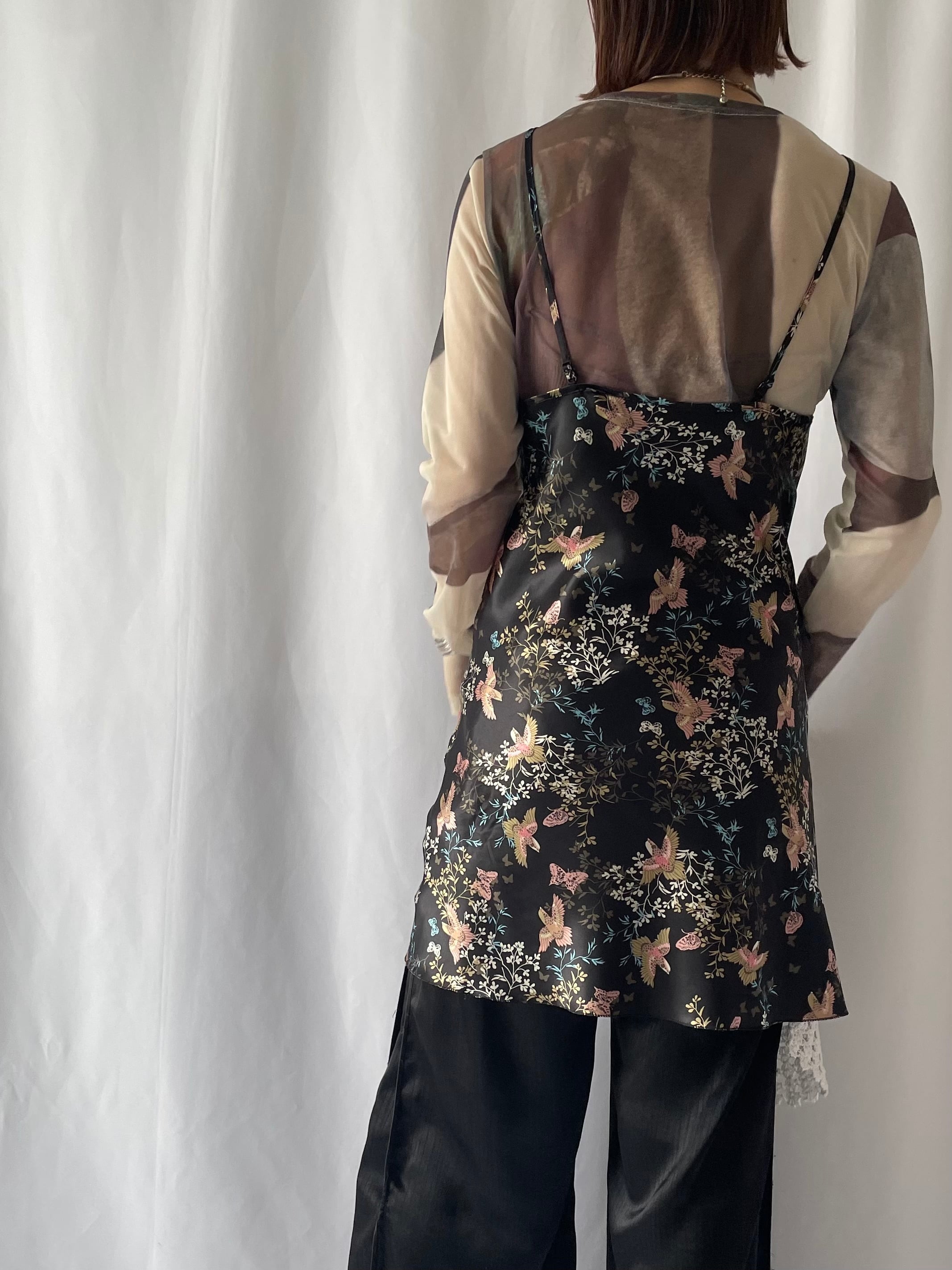 チャイナテイストプリントのスリップドレス。